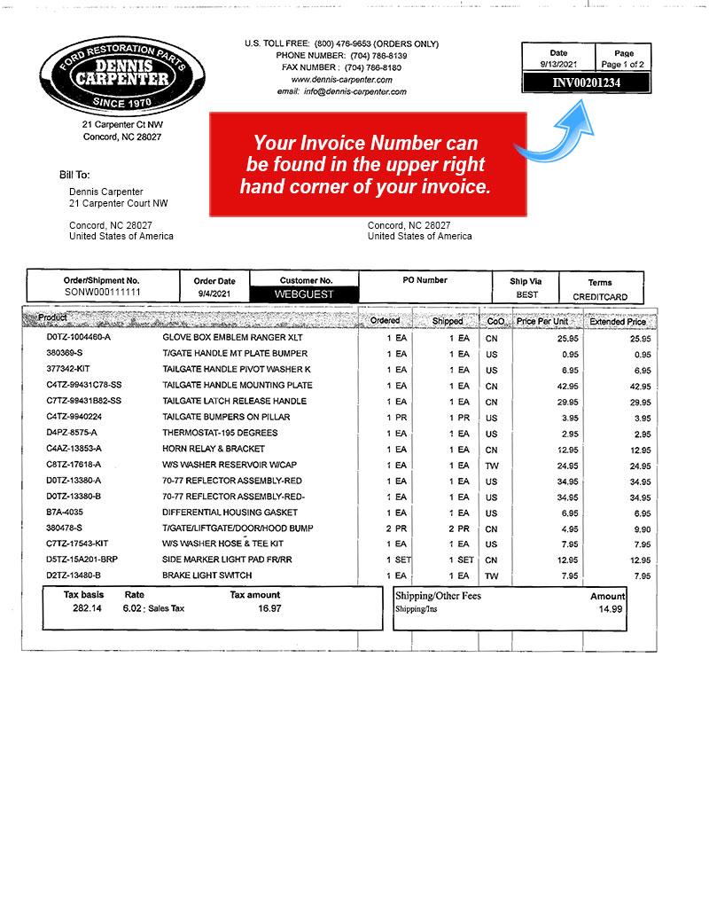 The invoice number can be found on your customer invoice included with your order. Please do not confuse this with your Web Order Number. Web Order Numbers begin with SONW. Invoice Number begin with INV.